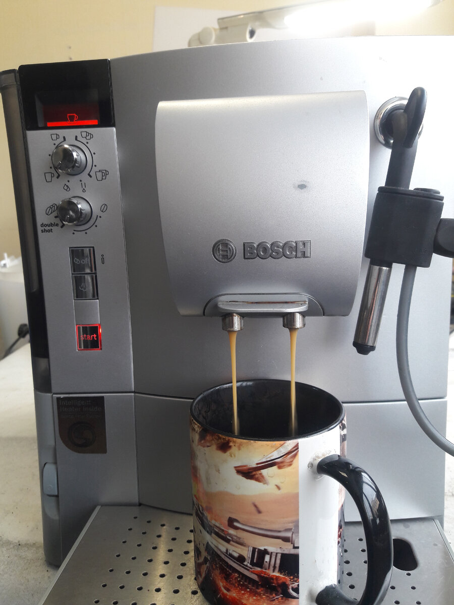 Ну и настал момент истины. Проверка! При включении кофемашина запросила произвести промывку системы. Промылась и предоставила возможность выбора напитка. Сделаем большой чёрный кофе!