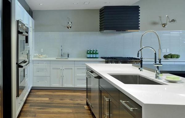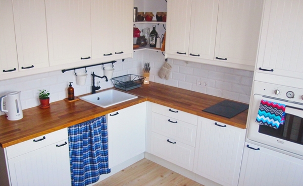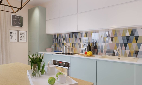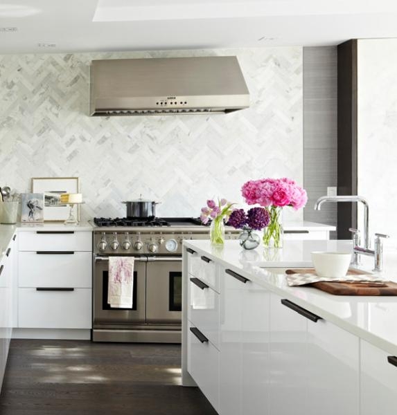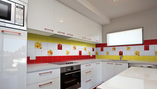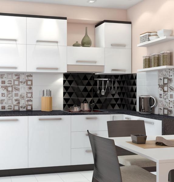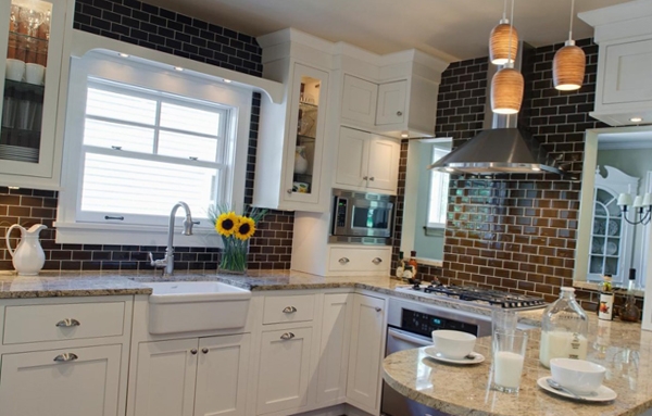 • контрастный фартук – создаёт интересный акцент, делает вид кухни более свежим и современным.