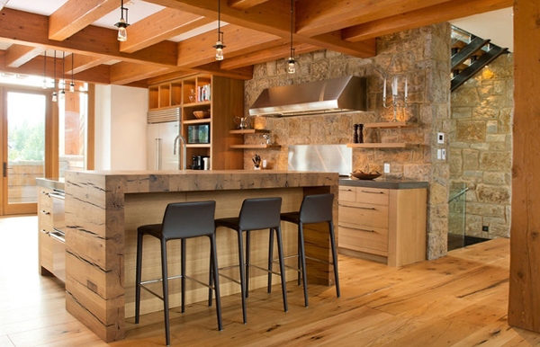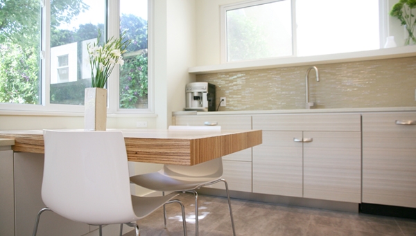 • Комбинирование материалов отделки может выполнять и другую важную функцию – зонирование пространства. Различные материалы позволяют установить видимые границы между рабочей и обеденной зоной.