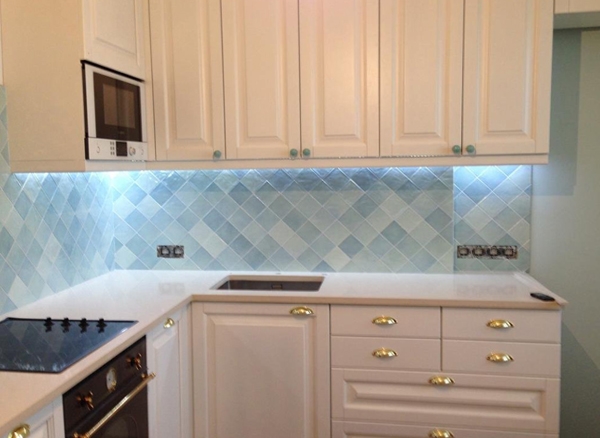 • фартук в тон кухне – выполняется в общей цветовой палитре, дополняет и обогащает кухонное пространство;