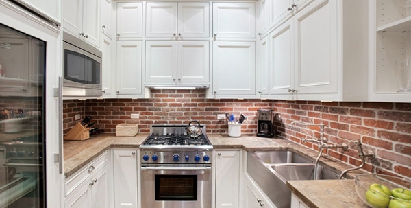 Кладка под кирпич, в отличие от мозаичной, не ограничивает вас в своём применении: вы можете отделать подобным образом фартук у рабочей поверхности, одну из стен, применив модным приём «accent wall», или «акцентная стена», или же выложить «кирпичной» плиткой все стены – помещение от этого ничего не потеряет!