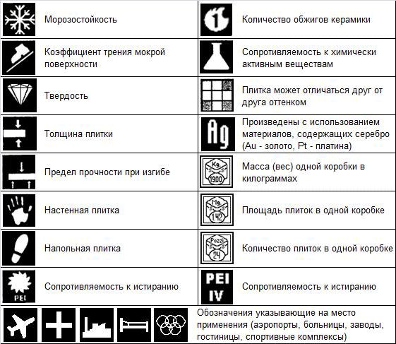 На коробке с керамической плиткой можно встретить ряд значков, призванных дать подробную характеристику находящейся в ней плитки:
