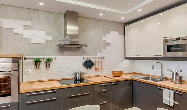 Можно выделить три основных направления в комбинировании материалов при отделке кухни: