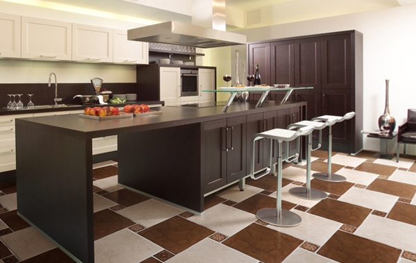 Во-первых, напольная плитка должна прочной, ведь ей предстоит испытывать на себе воздействие больших весов – холодильника, стола, кухонного гарнитура.