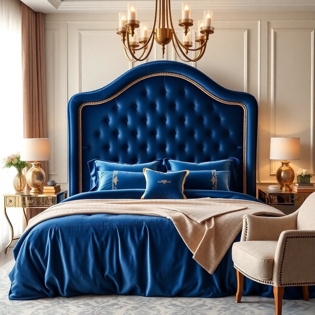 Кроме того, бархат обогащает визуальные ощущения, поглощая свет и создавая интересные отражения. Эти особенности делают каждую деталь не просто функциональной, но и эффектной, добавляя глубину и текстуру вашему интерьеру. Например, высокий изголовье кровати из бархата не только привлекает внимание, но и создает уютный акцент, легко перекрывающий пространство спальни. Каждый элемент, от ночных столиков до декоративных подушек, может быть выполнен в насыщенных синих оттенках, что позволяет привнести в дизайн индивидуальность и единство.